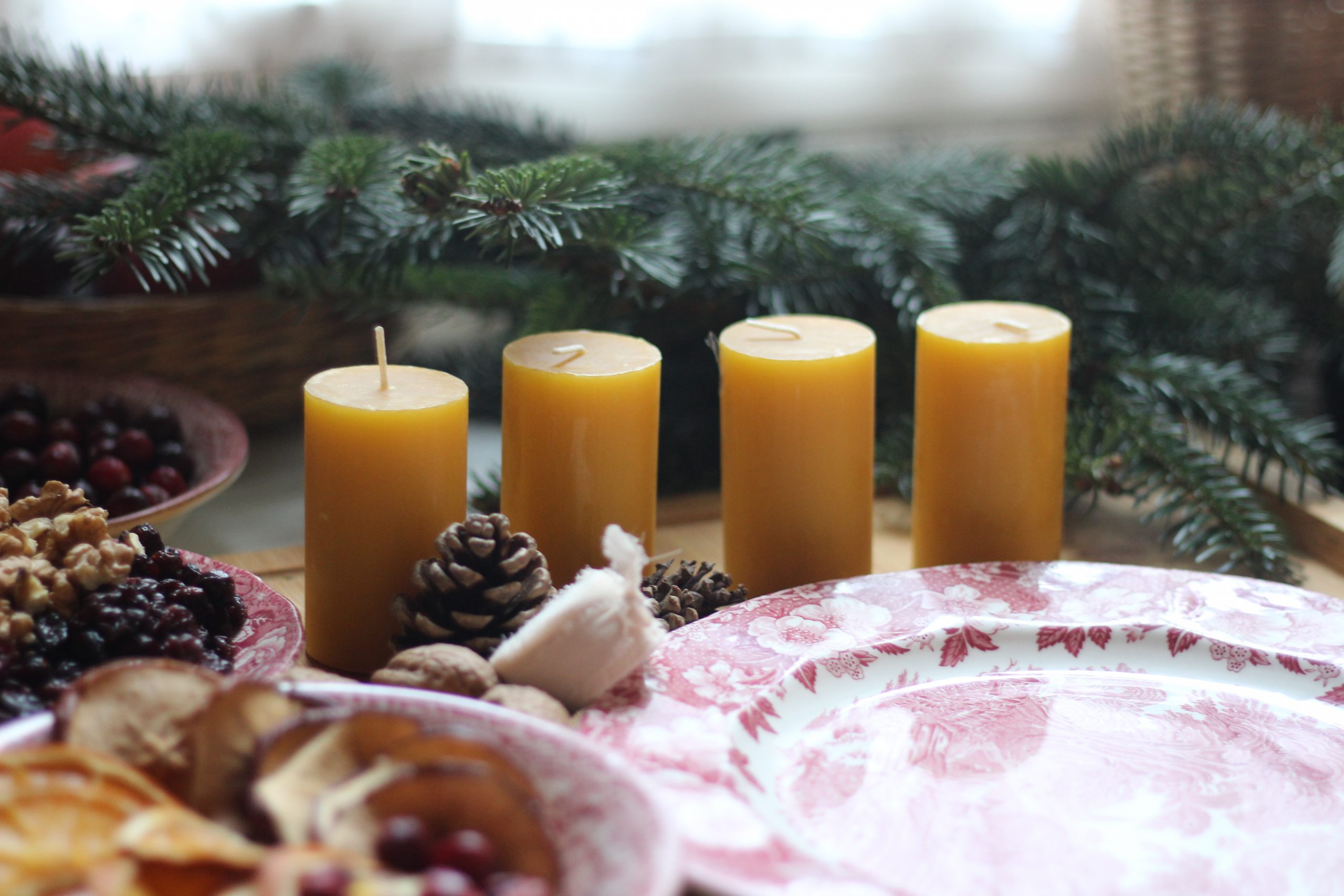 Achte bei der Wahl der Kerzen auf natürliche Materialien, die zum Look passen. Ich habe 100 % Bienenwachskerzen verwendet – sie sehen nicht nur schön aus, sondern duften auch dezent nach Honig und brennen sehr ruhig und gleichmäßig ab.