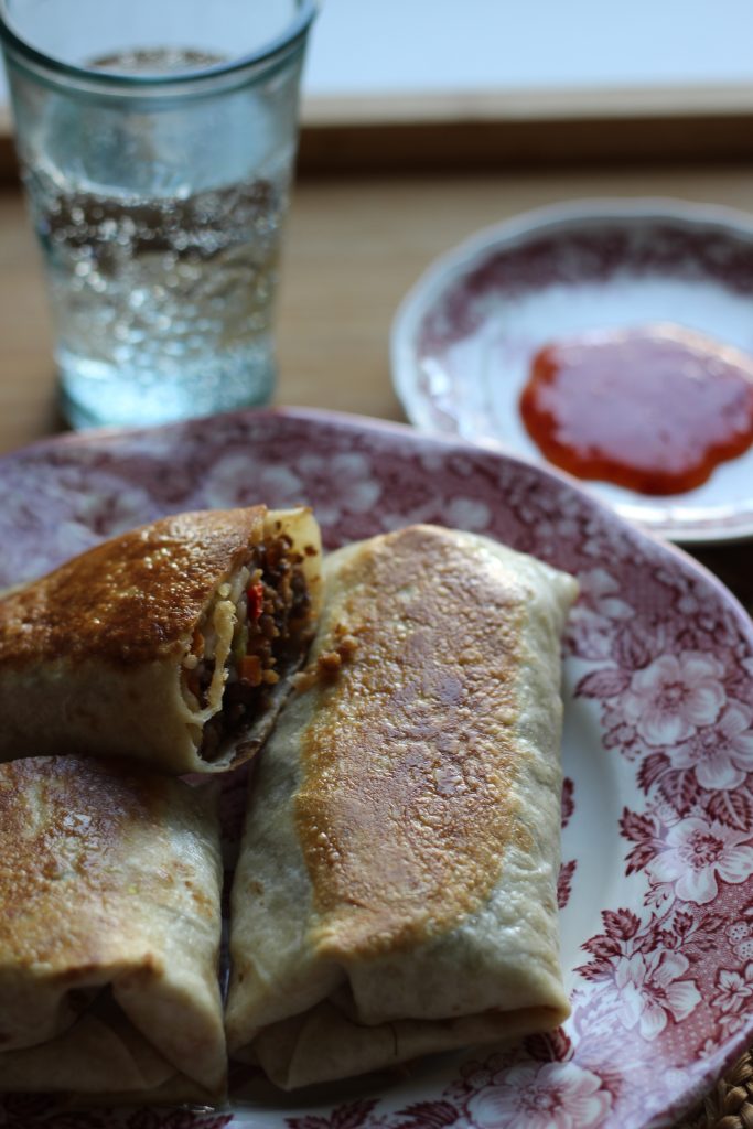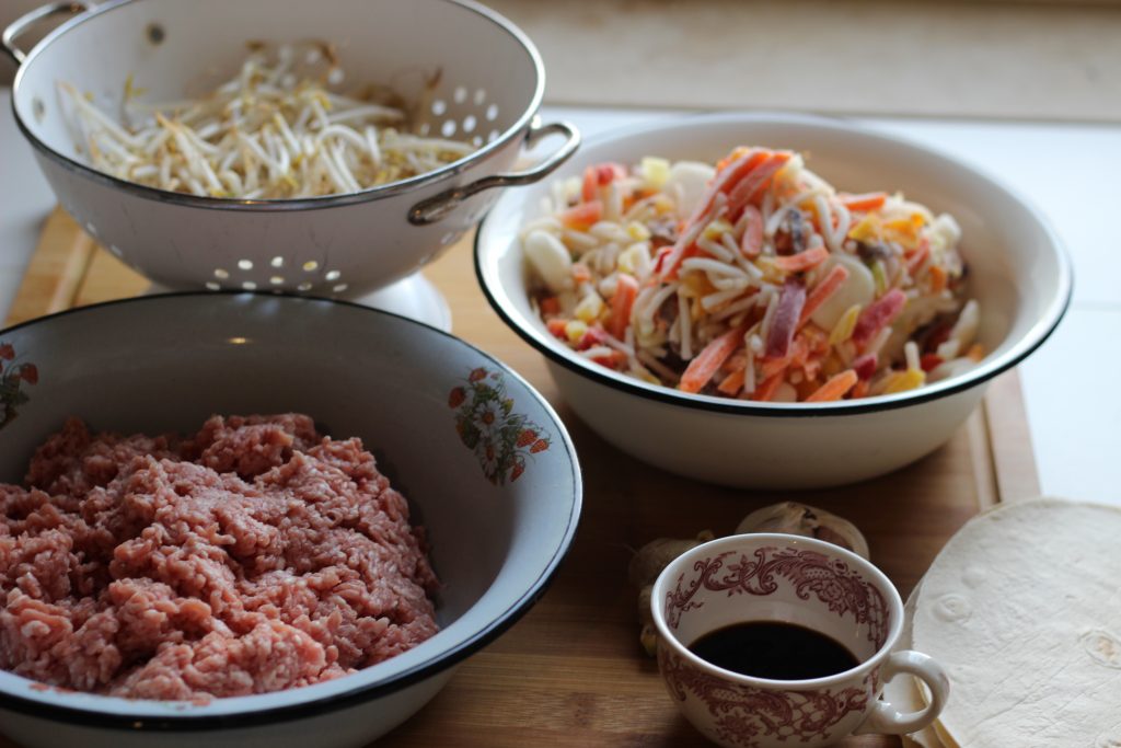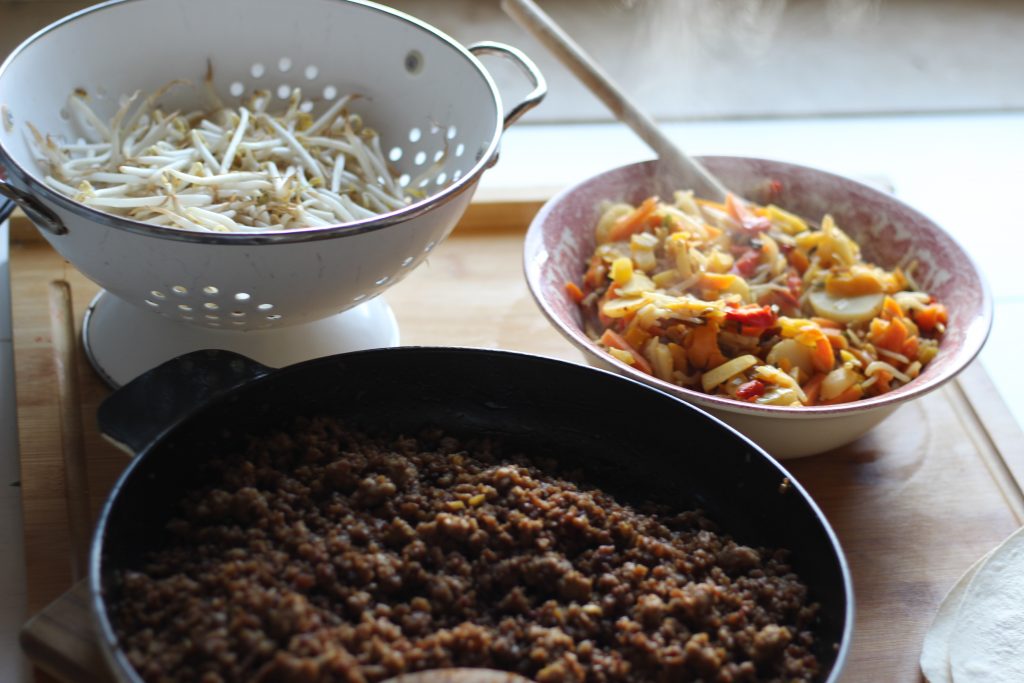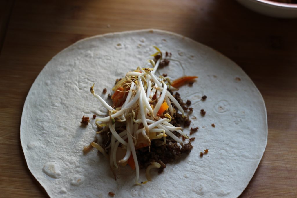 Lege einen Wrap auf deine Arbeitsunterlage und gib ein wenig von dem Fleisch, dem Gemüse und den Mungobohnensprossen darauf und wickle den Wrap ein indem du zuerst die Enden einklappst und den Wrap dann aufrollst. Sobald die Wraps alle aufgerollt sind, werden sie in einer Pfanne mit Öl angebraten bis der Teig eine schöne Farbe hat und knusprig ist.