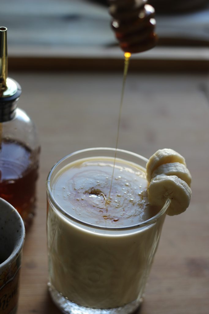 Gib alle Zutaten in einen Mixer und püriere sie, bis der Smoothie schön gleichmäßig und glatt ist. Verwende Honig nach Belieben und Geschmack.