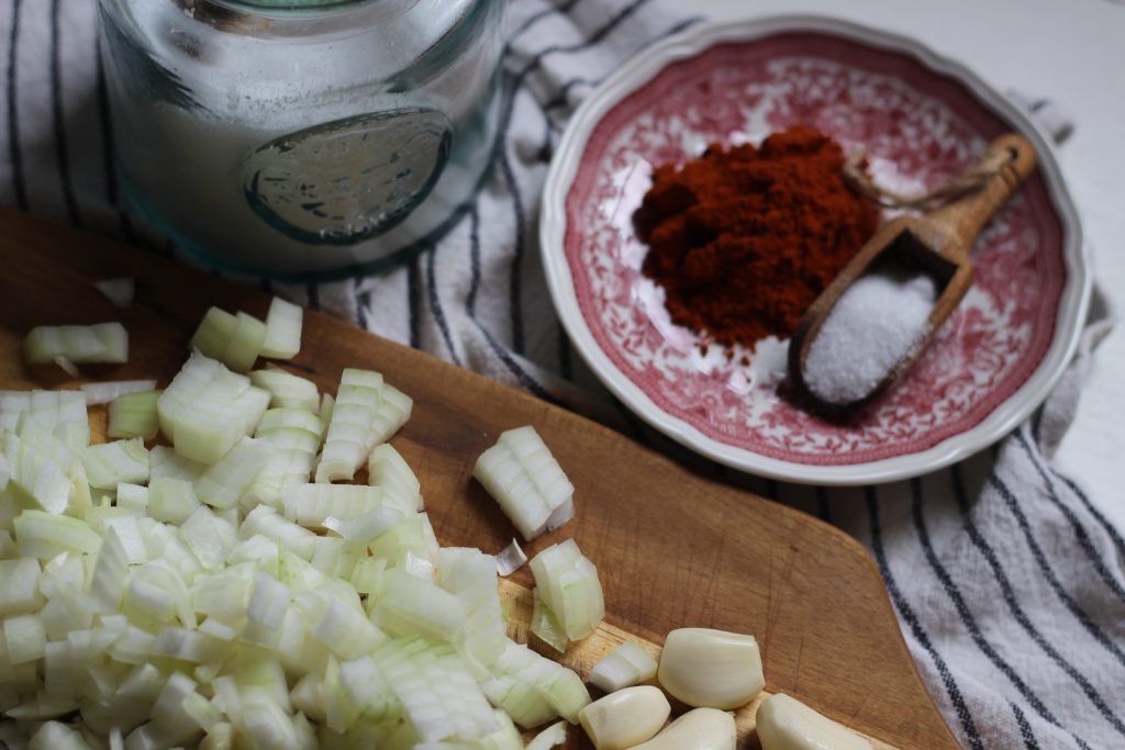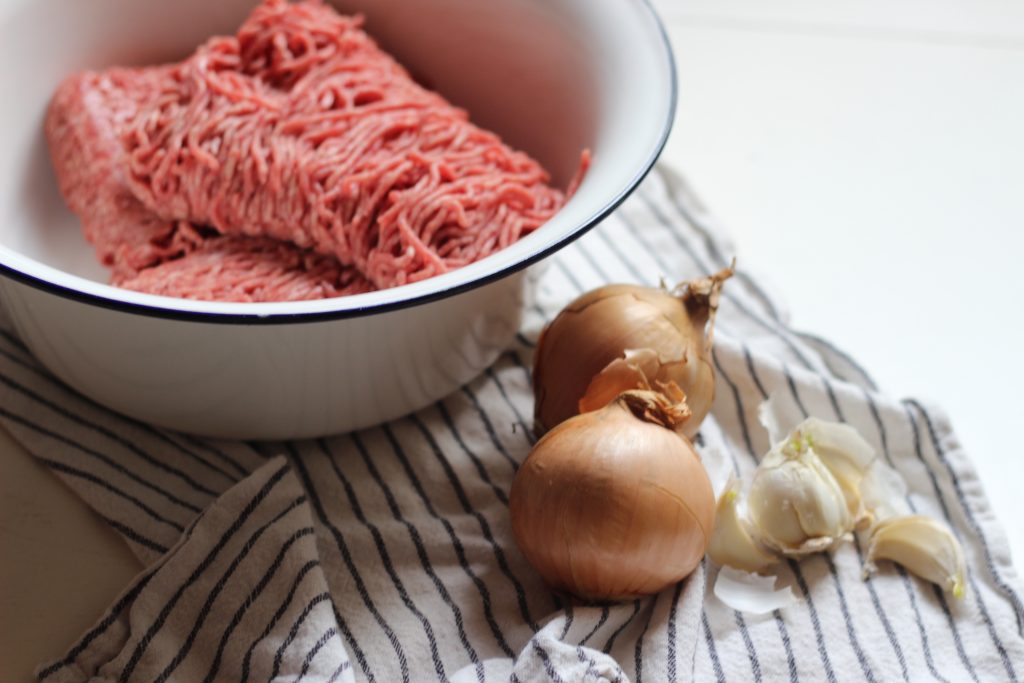 Das Rinderhackfleisch wird in einem Gusseisenbräter gut angebraten, sodass es teilweise gebräunt ist. Die klein geschnittenen Zwiebeln und Knoblauch werden in einer Pfanne mit Öl angedünstet bis sie glasig sind. Dann kommt das Tomatenmark dazu und wird leicht gebräunt und dann kommt das Ganze mit in den Bräter.