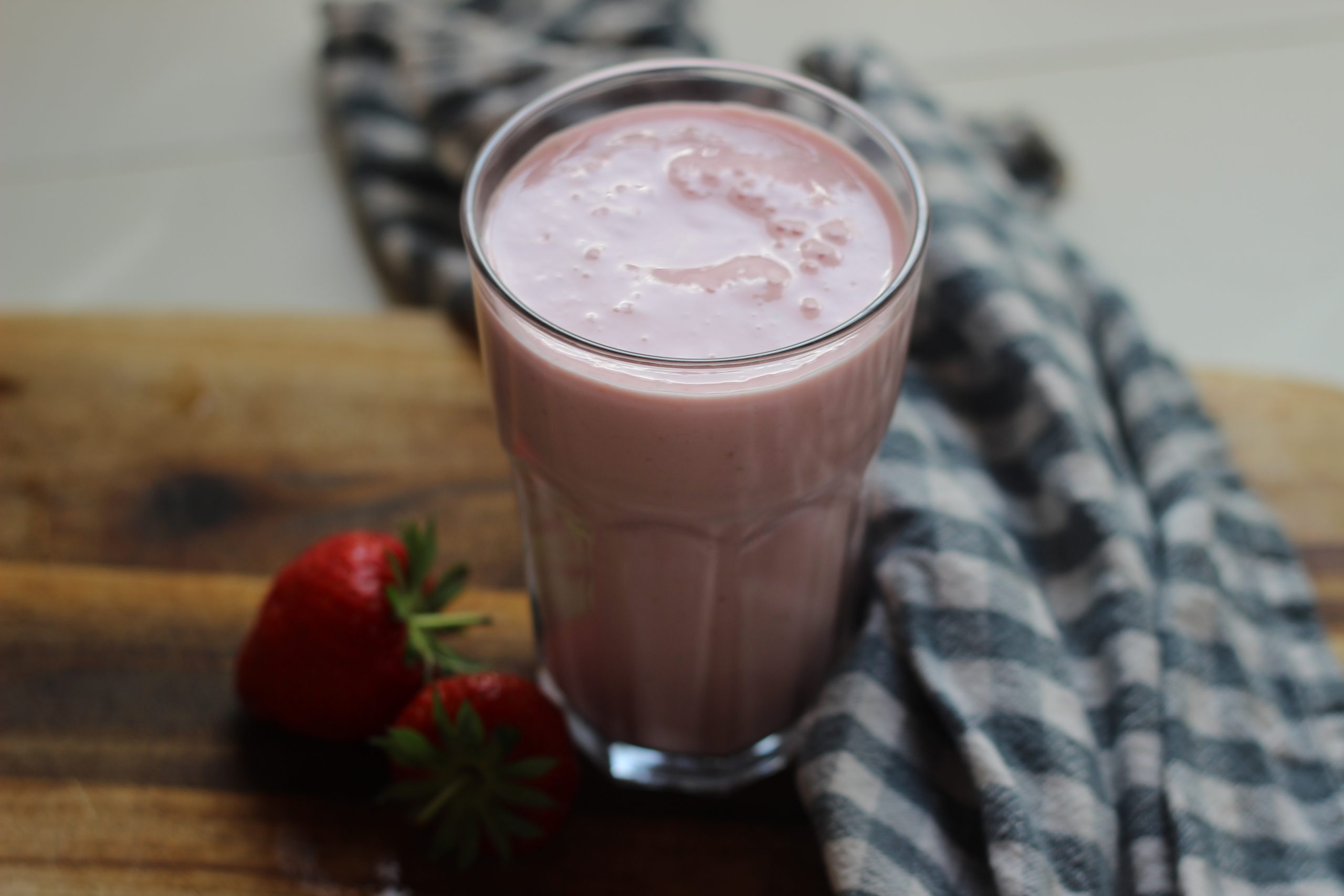 - Mit einem Standmixer oder Stabmixer alles gut pürieren, bis die Erdbeeren vollständig zerkleinert sind und der Smoothie schön cremig ist.