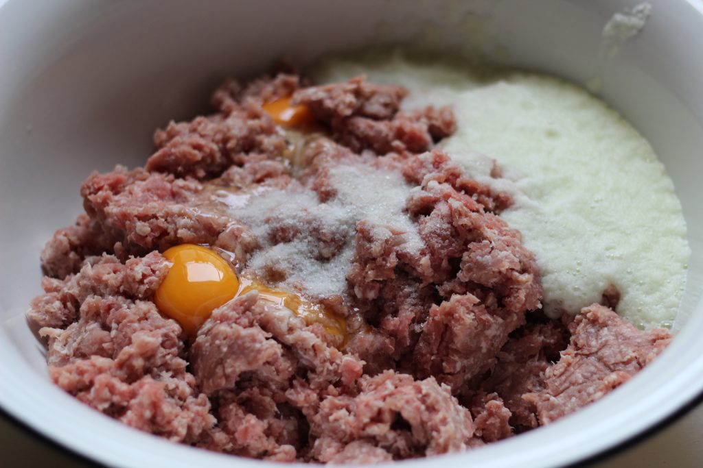 - zerkleinere die Zwiebeln mit einer Küchenmaschine oder einem Fleischwolf damit die Frikadellen gleichmäßig werden