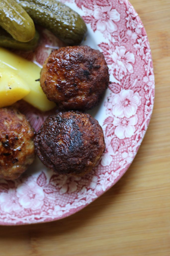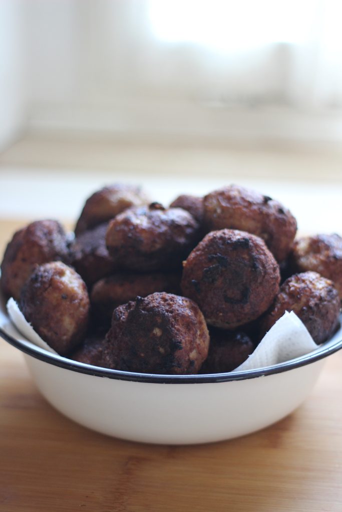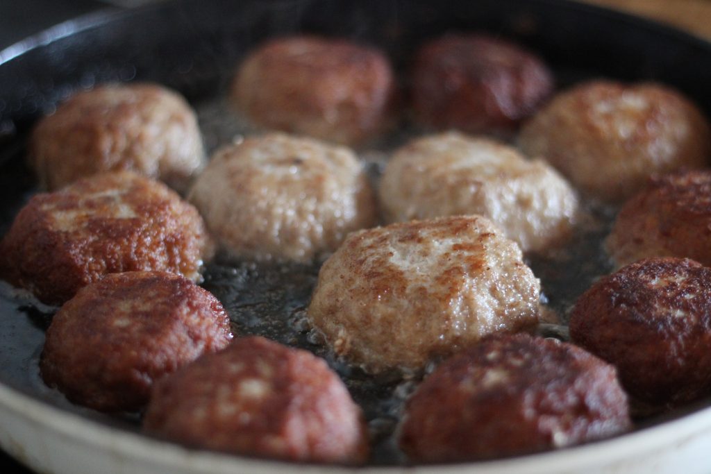 Nun alle Zutaten gut miteinander vermengen und daraus kleine Bällchen formen. Eine Pfanne (ich habe eine Gusseisenpfanne verwendet) mit dem Bratfett auffüllen sodas die Frikadellen zur Hälfte bedeckt wären und heiß werden lassen. Sobald das Fett heiß ist, die Frikadellen hinein geben und bei mittlerer Hitze von beiden Seiten gut braun werden lassen.