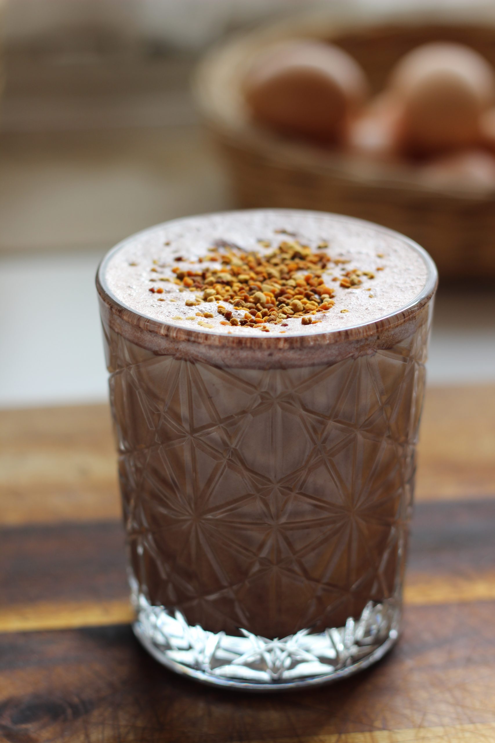 Anschließend das Getränk in ein schönes Glas füllen und mit Bienenpollen bestreuen.
