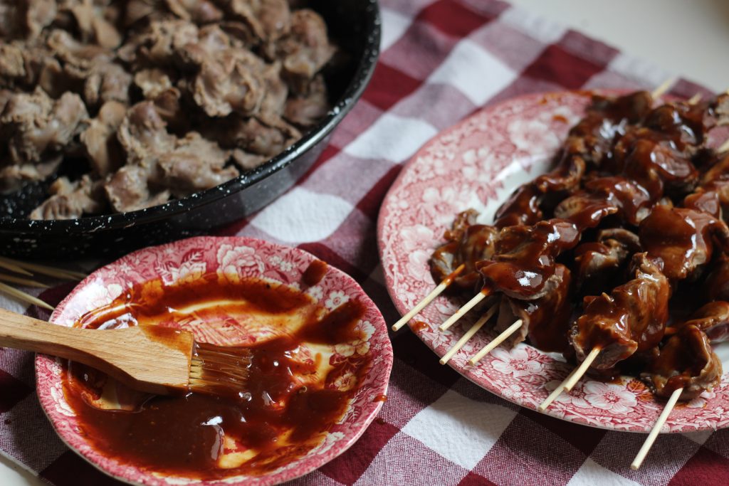 Nach dem kochen werden die Hühnermägen abgesiebt und nach kurzer Abkühlzeit aufgespießt und mit reichlich Barbecuesauce bestrichen. Die fertigen Spieße können so eine Weile zum marinieren in den Kühlschrank gestellt werden.