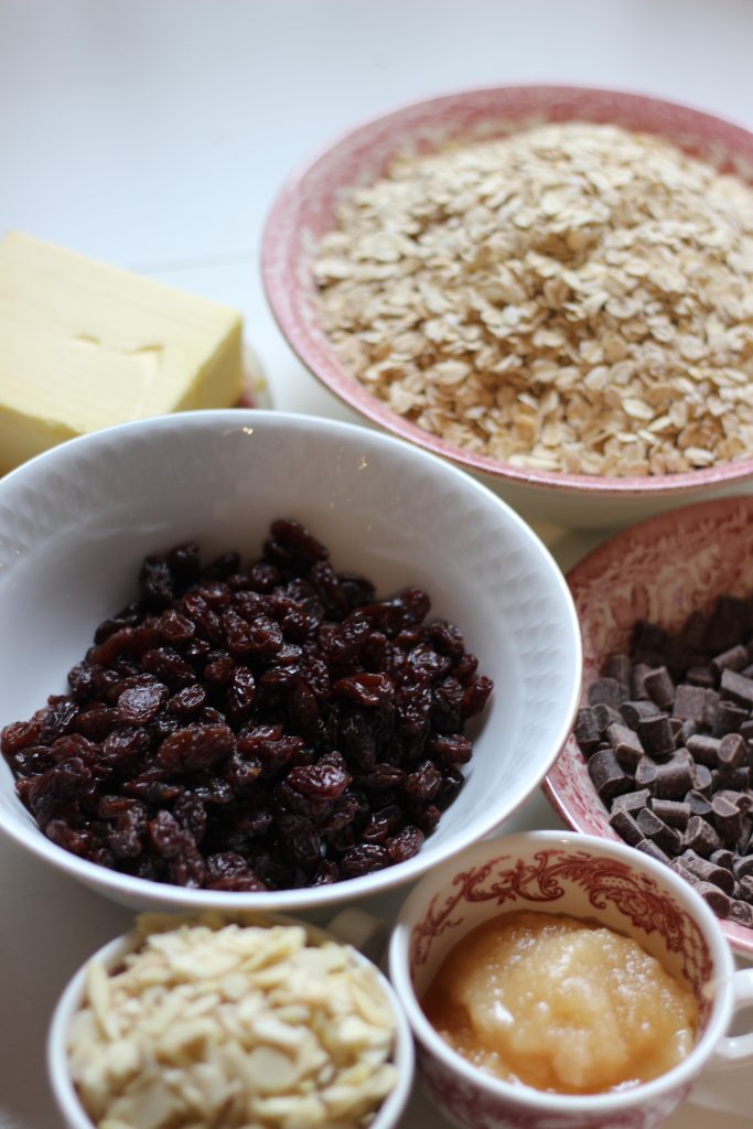 Vermische zunächst die Haferflocken, Mandeln und Rosinen in einer großen Schüssel.