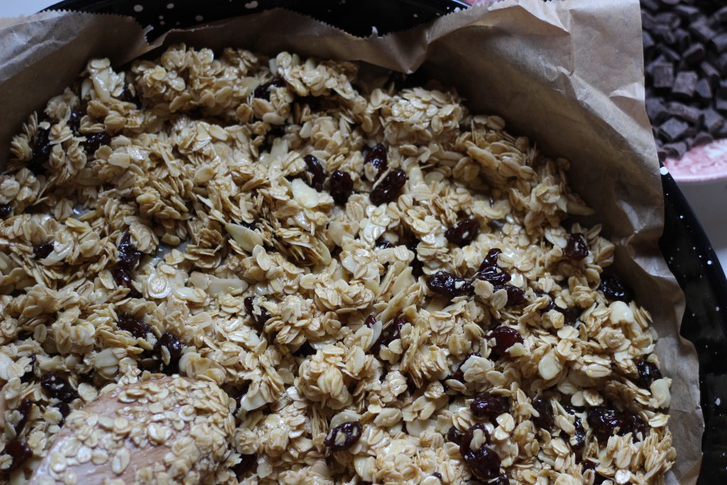 Dann ist das Granola schon bereit für den Backofen und kann auf einem Backblech verstrichen werden.