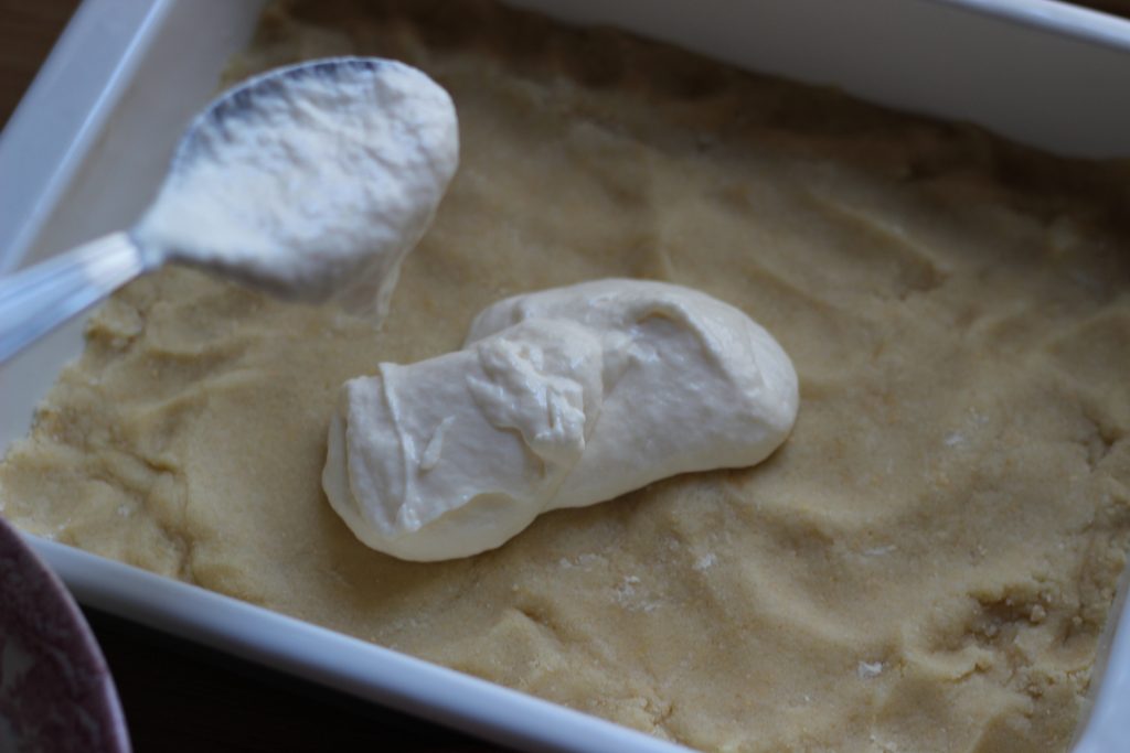 Verteile die Hälfte des Teiges gleichmäßig in einer ofenfesten Form und drücke ihn leicht an, sodass eine gleichmäßige Grundlage entsteht.