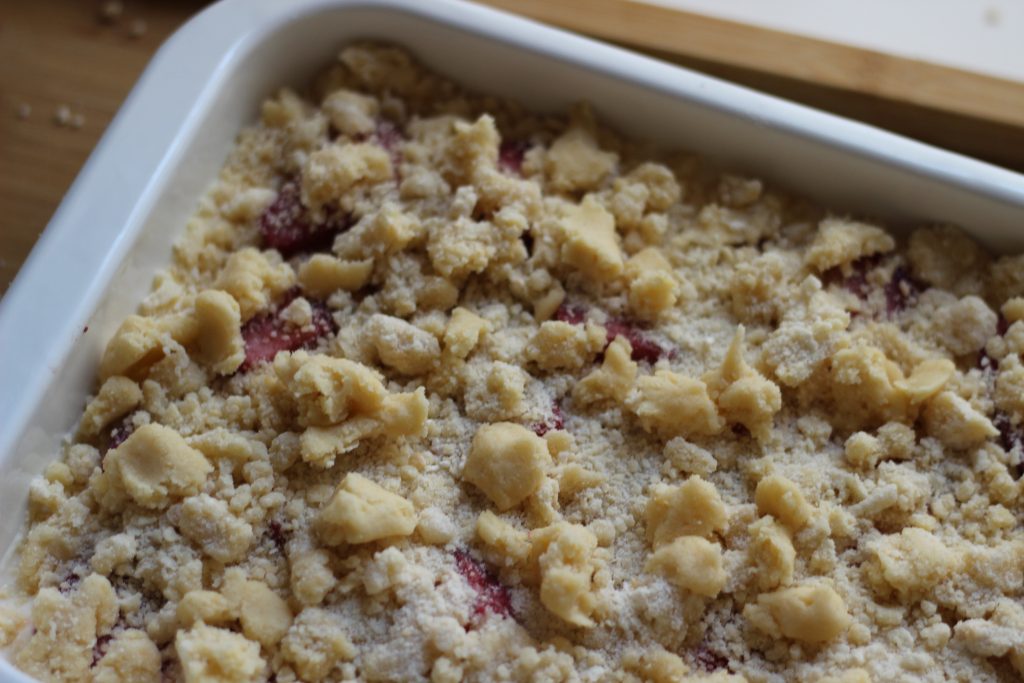 Verteile nun die restlichen Streusel gleichmäßig über die Erdbeeren. So entsteht die typisch knusprige Streuselschicht, die dem Kuchen seinen unwiderstehlichen Charme verleiht.