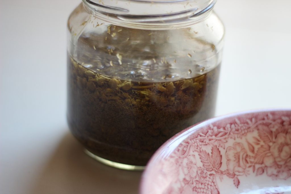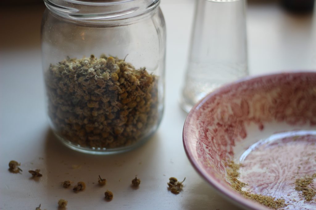 Befülle ein Schraubglas bis zu zwei Drittel mit den getrockneten Kamillenblüten und fülle das Glas dann mit dem Alkohol auf bis die Blüten bedeckt sind.