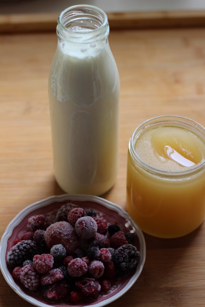 Kefir enthält von Natur aus viele Vitamine, Mineralien und Probiotika und unterstützt die Darmflora. Beeren liefern Mineralien, Antioxidantien und Ballaststoffe.