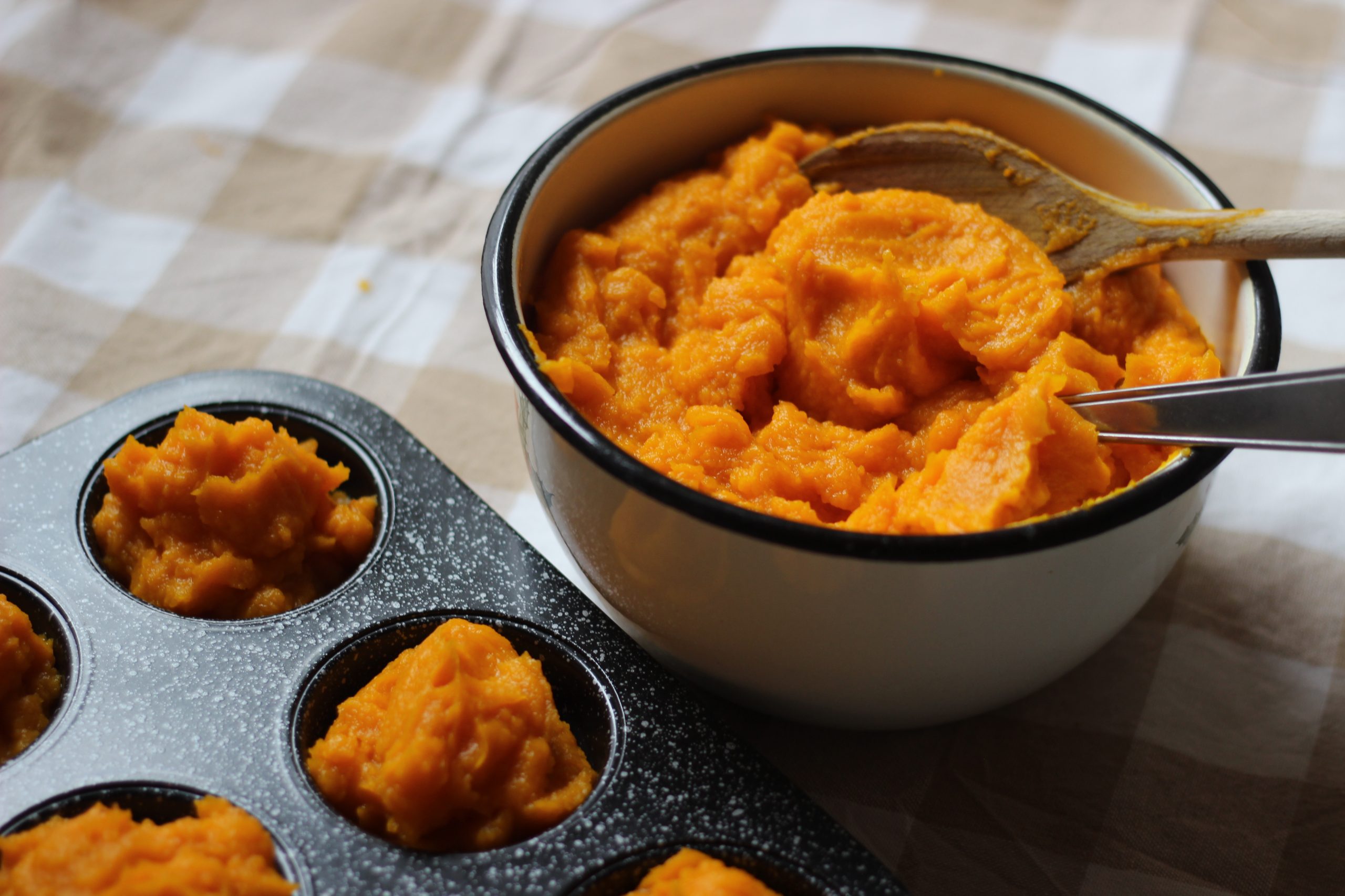 Am einfachsten friere ich mein Kürbispürree in einer Muffinbackform ein. So entstehen kleine Portionen, die jeweils etwa 75 g wiegen – ideal für einzelne Rezepte. Wenn das Püree in der Form gefroren ist, kannst du die Portionen einfach herauslösen und in einem Gefrierbeutel oder einer Box lagern.