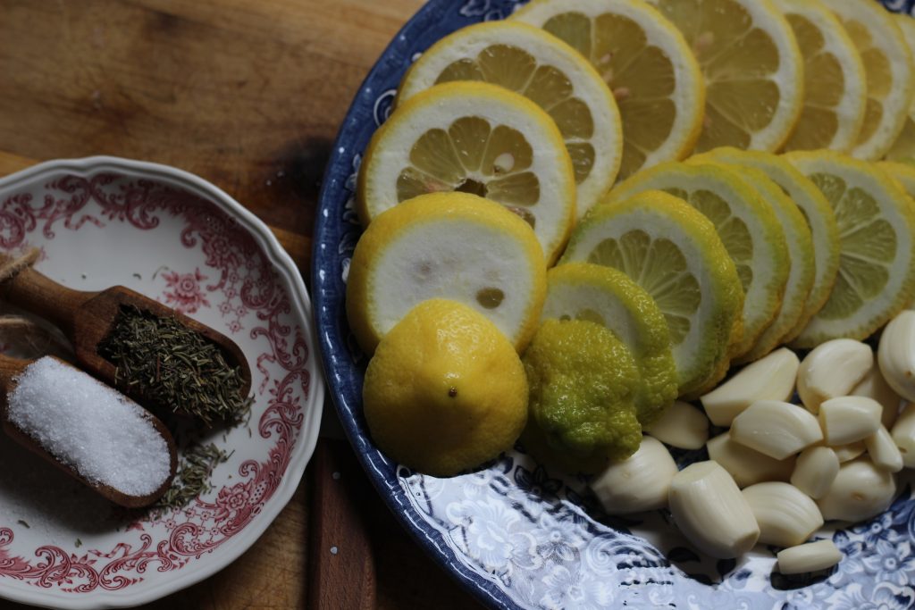 Schäle den Knoblauch, die Zehen kannst du ganz lassen – sie werden im Ofen schön weich und aromatisch. Verteile sie zwischen Fleisch und Kartoffeln. Die Zitronen in Scheiben schneiden und ebenfalls auf dem Blech verteilen. Abschließend alles mit Pfeffer, Thymian und ggf. noch etwas mehr Olivenöl würzen.