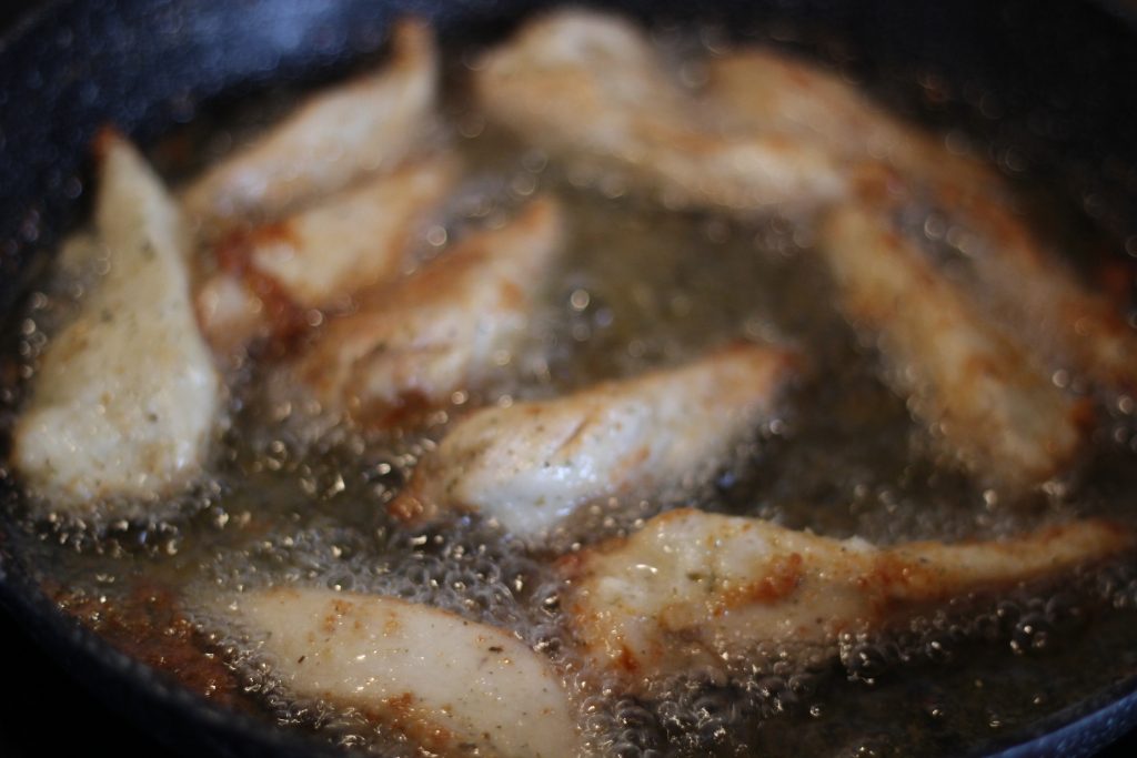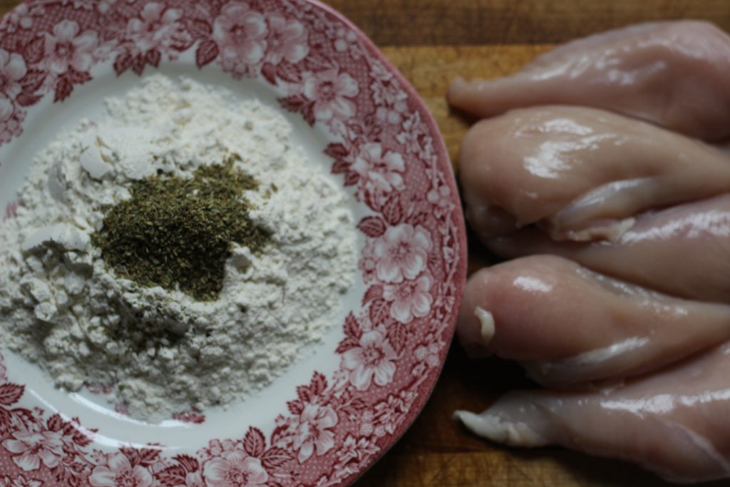 Schneide die Hühnerbrustfilets in Streifen indem du ein Hühnerbrustfilet längs in 3 Teile schneidest. Mische das Mehl mit dem Salz und den Kräutern und lass das Öl in der Pfanne heiße werden. Wälze alle Streifen in der Mehl-Kräuter-Mischung und gib sie in die heiße Pfanne und brate sie an bis sie goldbraun sind.