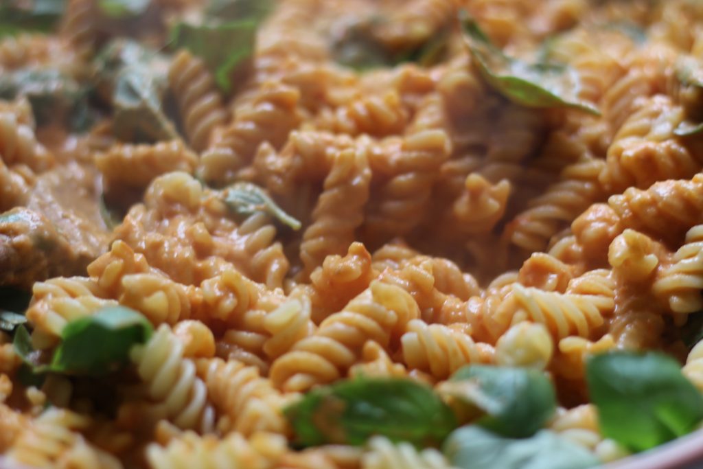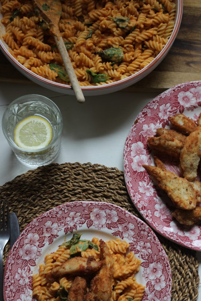 Nudeln mit cremiger Tomatensauce und knusprigen Hühnerstreifen