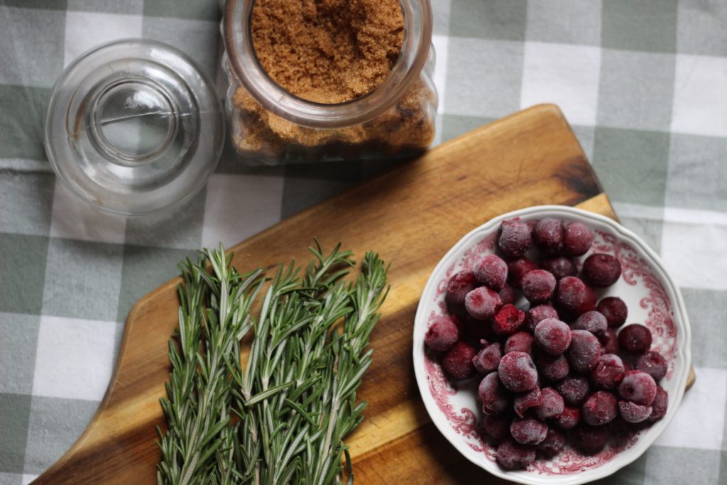 Die restlichen Kirschen mit den Rosmarinzweigen, Zucker und Wasser in einen kleinen Topf geben. Optional die Wintergewürze hinzufügen.