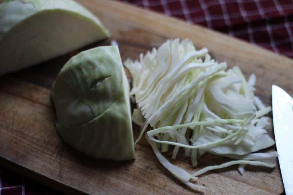 - Für den Schmuakomst sollte der Weißkohl in möglichst gleichmäßige, feine Streifen geschnitten werden.