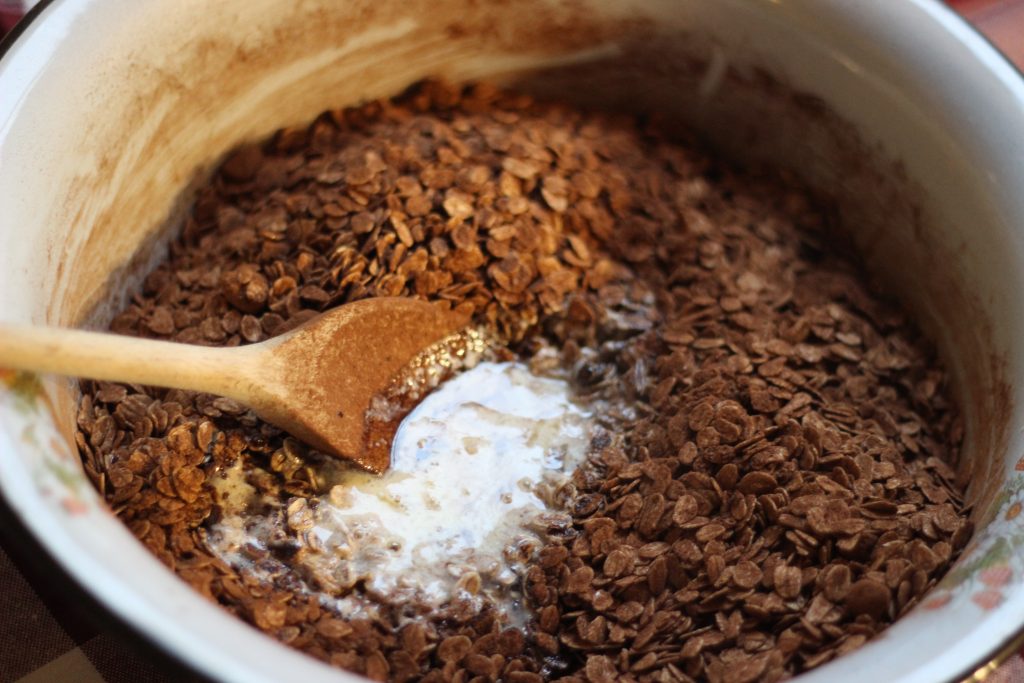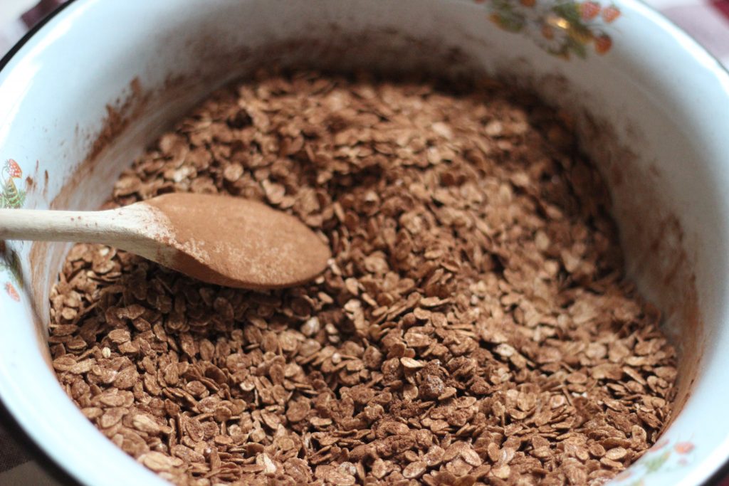 Vermische zunächst die Haferflocken mit dem braunen Zucker und den Kakao.