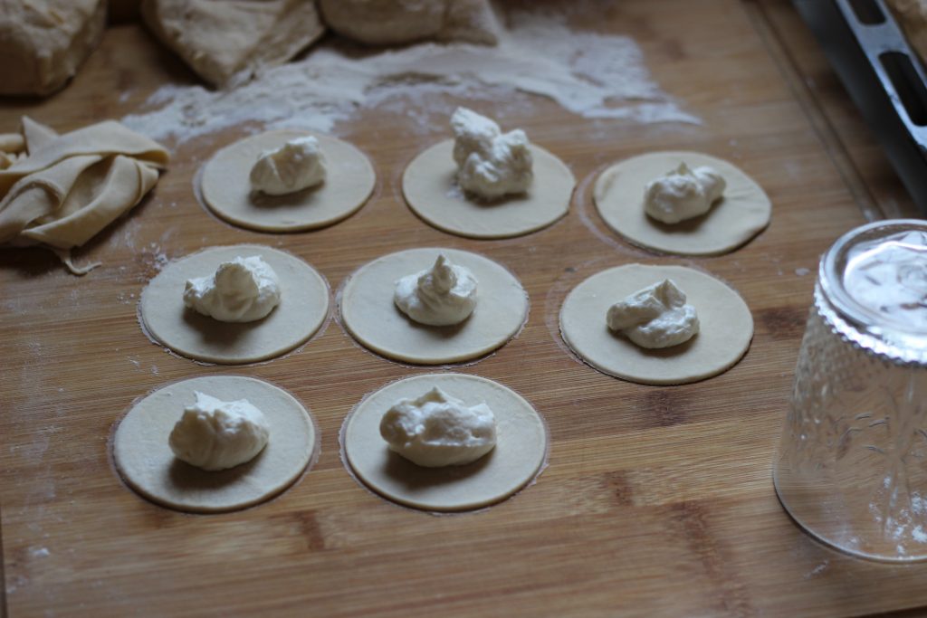 Den Teig in Portionen dünn ausrollen und mit einem Glas oder dem Teigformer Kreise ausstechen, mit einem gehäuften Teelöffel Füllung belegen und anschließend die Enden gut verschließen.