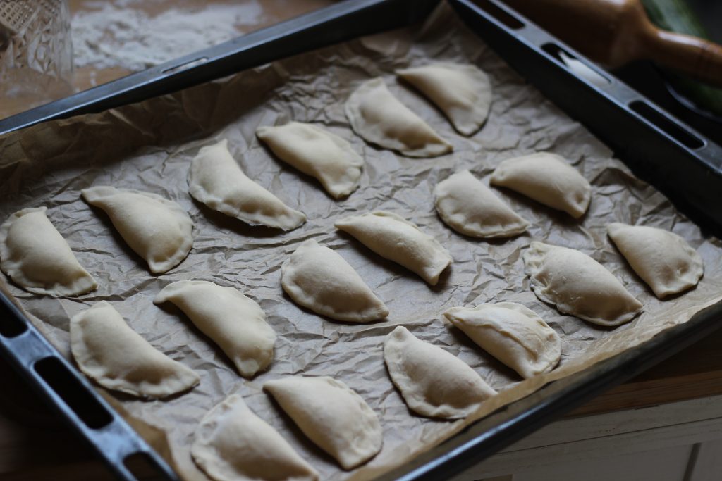 Bis zum kochen können die Wareniki gut auf einem mit Backpapier ausgelegten Backblech gesammelt werden.